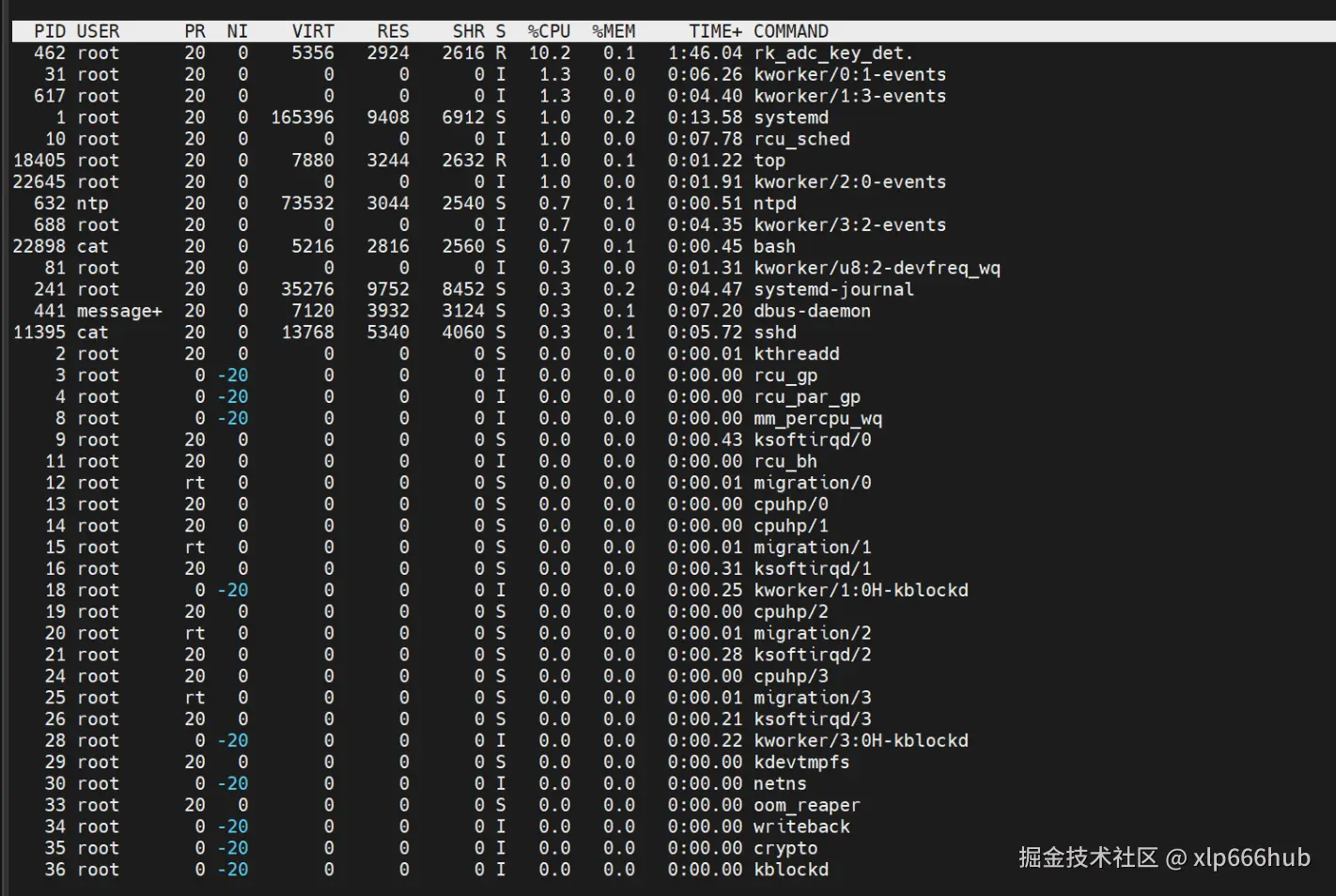 top 命令默认是按照 CPU 占用排序的,这里并没有找到我们的应用程序,恰恰说明我们的程序已经进入休眠了,正在等待按键按下,因此它并不会空耗 CPU。