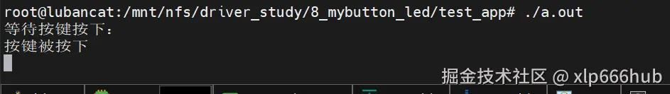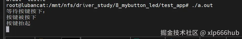 下面,我们准备按下按键,同时观察用户程序、内核日志与 LED 的变化:
