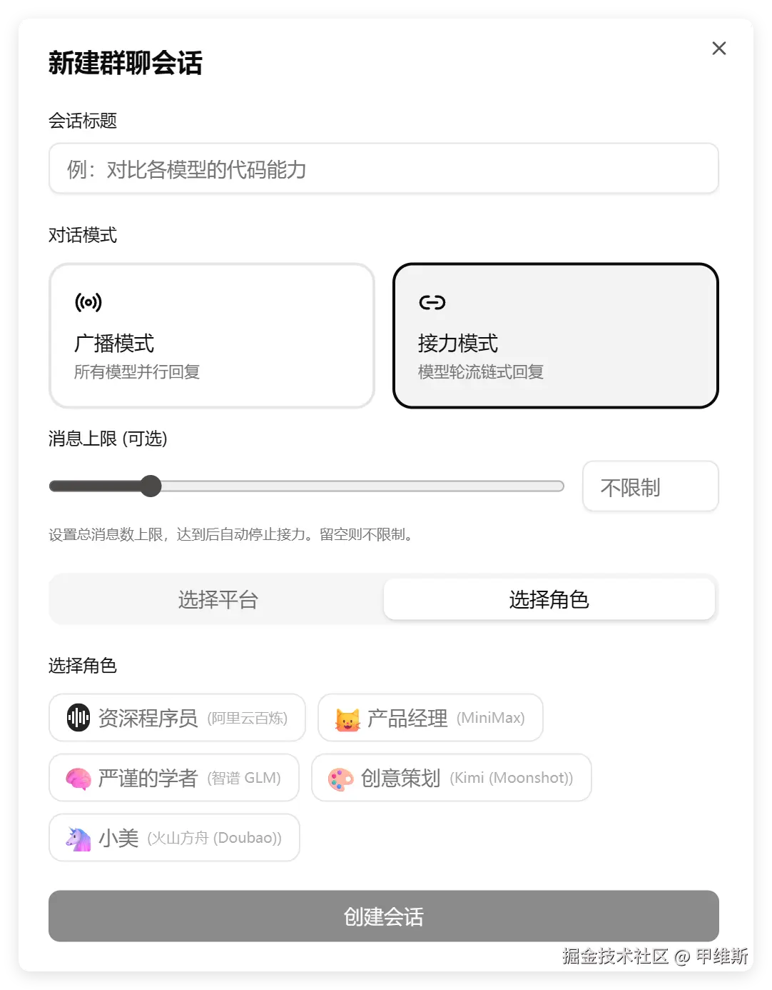 - 群聊接力时,用户选的是平台,角色只是平台的附属配置