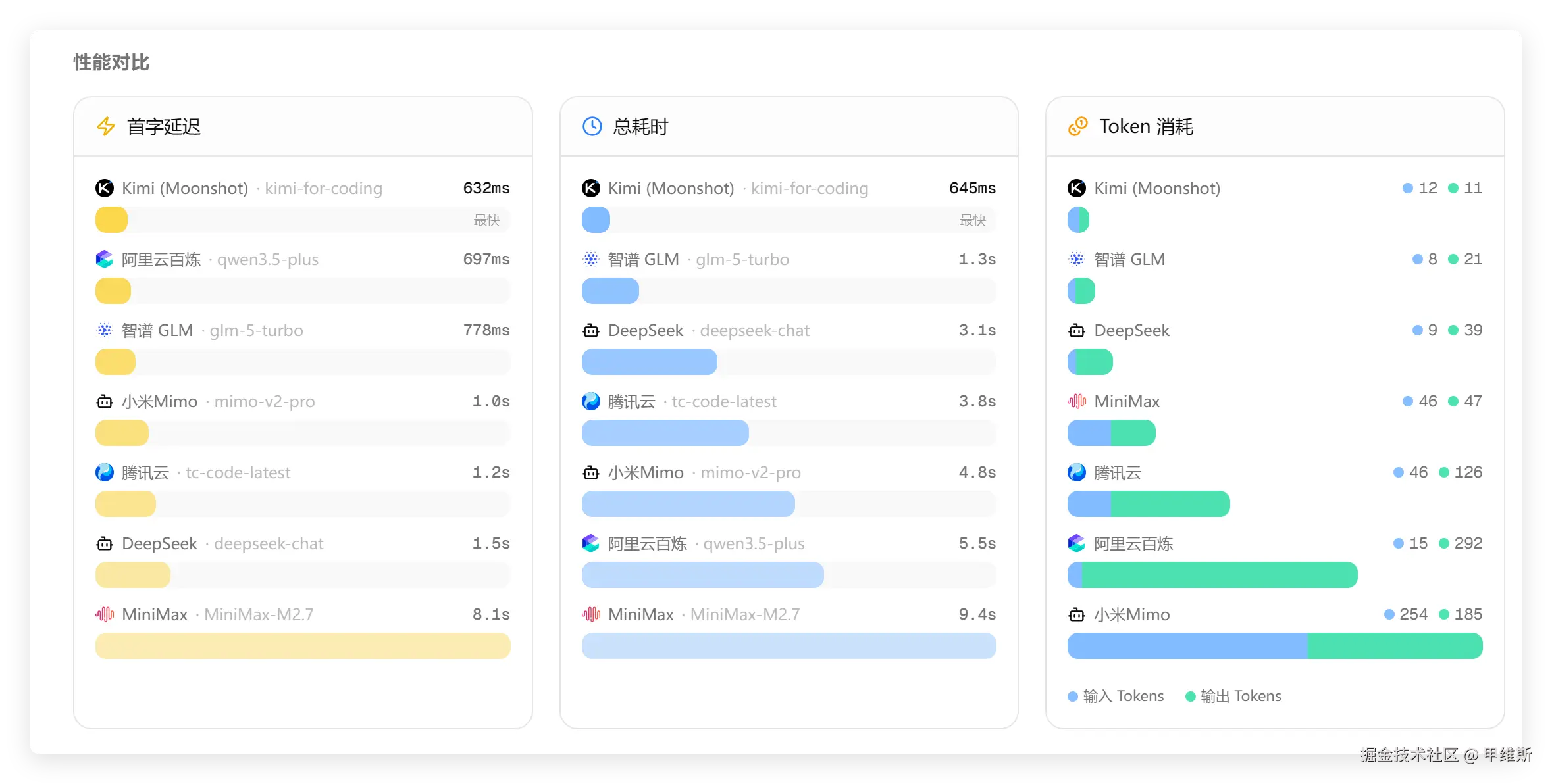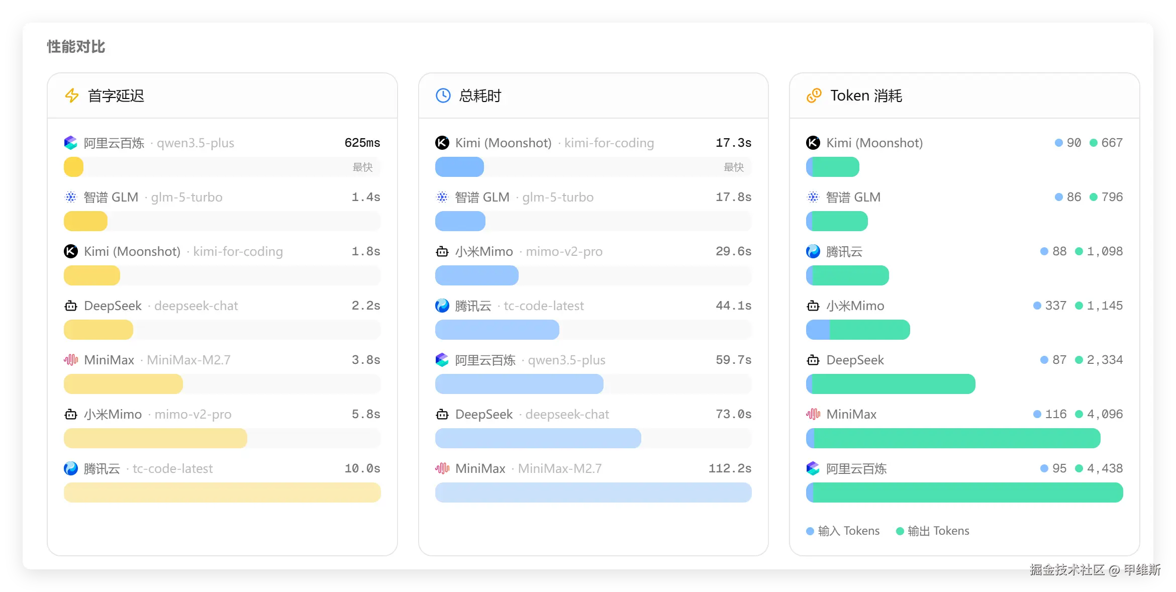 从速度来看的话,GLM-5-Turbo 还是数一数二的存在。除了首次延迟方面阿里云老是抢第一,总耗时方面 Kimi 总是抢第一之外,基本上下一个就是 GLM-5-Turbo 了。