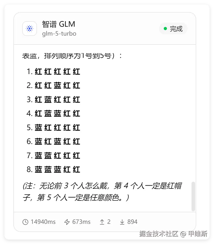 GLM-5 满血版是可以轻松答对这个问题的,但是 Turbo 试了很多次,都没有直接给出准确的答案。