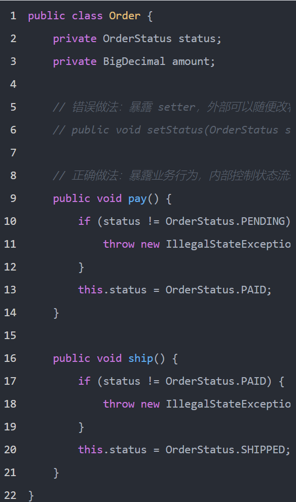 真正的封装是暴露行为而不是数据,比如支付类,里面有status状态字段,不应该暴露setStatus()让外界随便修改状态,而是添加支付pay()和取消支付cencel()等方法,让外界通过这些业务方法来修改状态。