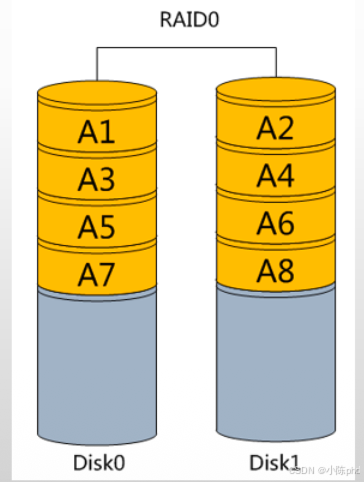 - 核心原理:将数据平均分成若干块,分散存储在多块磁盘上,无数据冗余和校验;