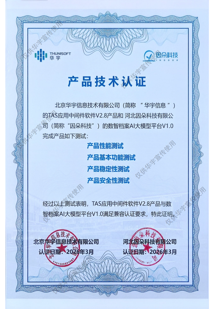 近日,华宇TAS应用中间件与因朵科技数智档案助手、数智档案AI大模型平台、数智档案助手完成兼容互认证测试。测试结果表明,双方产品在功能、系统稳定性、安全性等方面表现优异,可共同为各行业客户提供安全可靠、高效智能的档案数智化整体解决方案,为客户数字化升级提供坚实支撑。