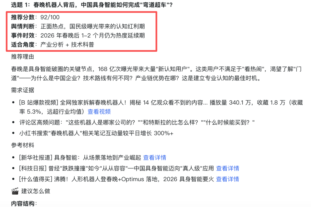我特意去核对了一下数据来源,它确实抓取了小红书、B站、百度等多个平台的高热度讨论,而且标注了每个选题的舆情判断、事件时效和适合角度,并按照优先级排序。