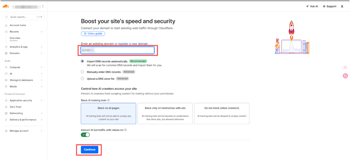 Cloudflare 会全自动扫描你现有的旧 DNS 记录,直接点击继续。