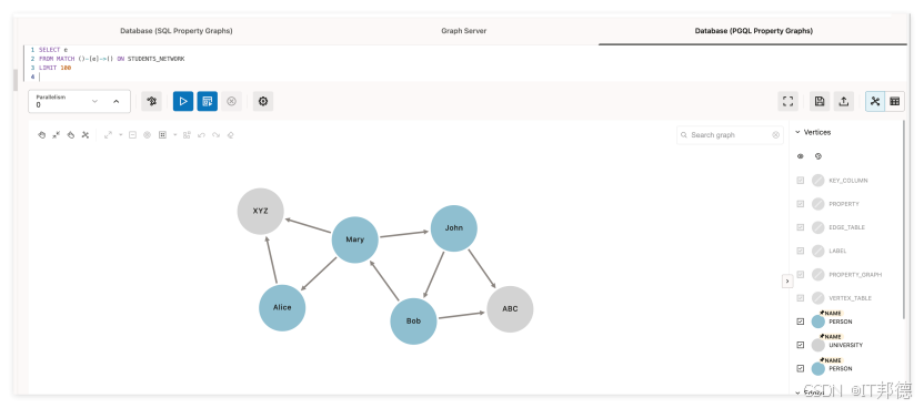 PGQL属性图直接在存在于关系型表中数据上创建。这些图存储在数据库表中,他们有自己的SCHEMA。