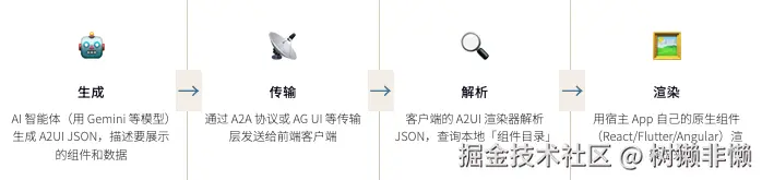- 生成:AI 智能体(用 Gemini 等模型)生成 A2UI JSON,描述要展示的组件和数据。