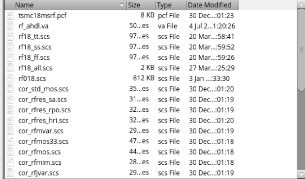 大家可以看到,上图的文件名称里面有很多熟悉的身影:res(电阻缩写)、rfmos(射频MOS管)、dio(二极管)等,所以可以推测的是,这些是对应器件的独立的工艺角模型文件