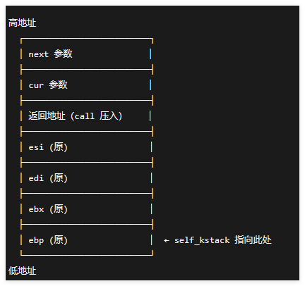 恢复下一个线程的上下文:从参数 next 的PCB中取出 self_kstack 指针,将其赋给 esp,使CPU切换到下一个线程的内核栈;随后从该栈中弹出先前保存的 ebp、ebx、edi、esi,最后通过 ret 指令返回到下一个线程之前被切换时的执行点。
