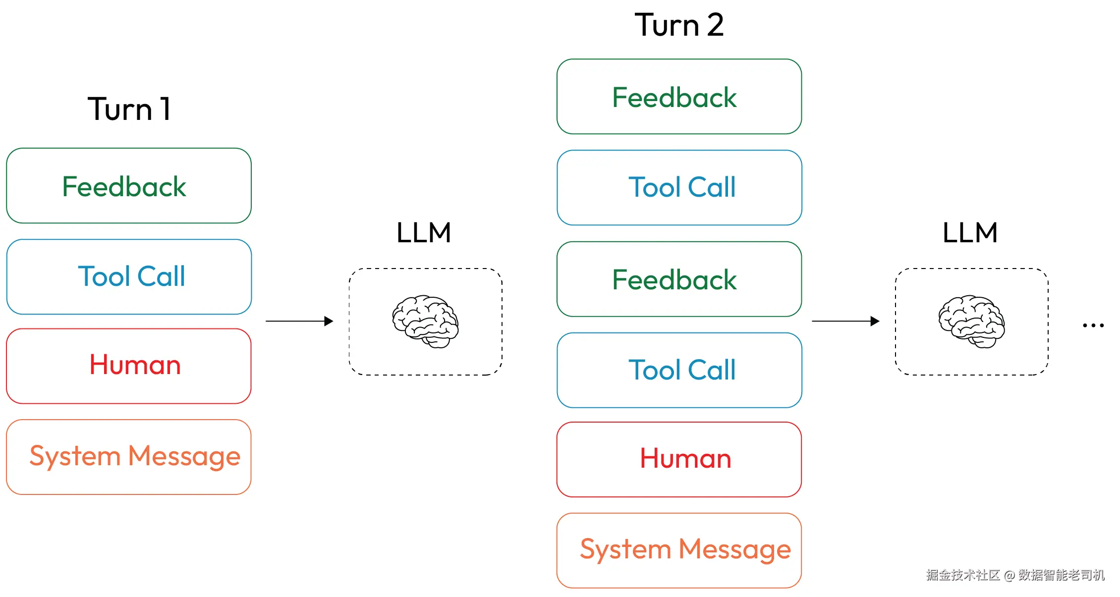 图 1.3 ------ 多轮交互中的上下文增长 (改编自 LangChain 讨论的相关概念,www.langchain.com)