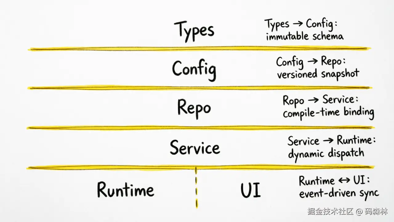 Types → Config → Repo → Service → Runtime → UI