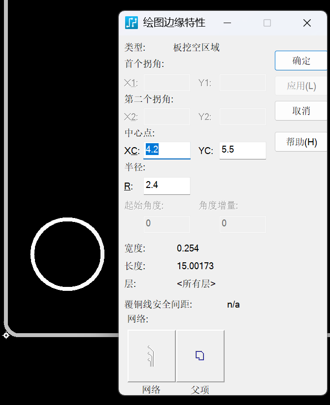选中板框工具,右键圆形 -- 放置一个圆后 -- 右键选中板框 --双击圆形,修改圆的位置和半径