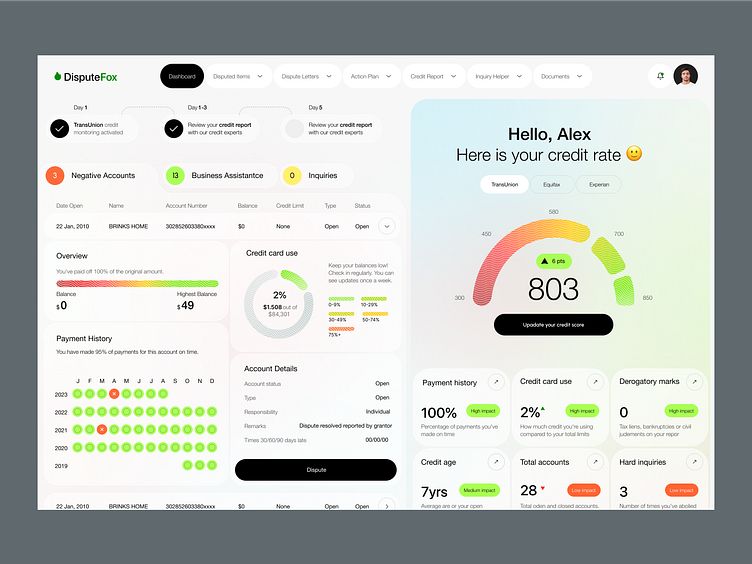 - 信息层级:以信用分 803 为核心视觉锚点,用弧形仪表盘直观展示分数区间,同时拆解还款历史、信用卡使用率等关键指标,让用户快速掌握信用状态,契合北京兰亭妙微 "专业数据轻量化呈现" 的设计理念。