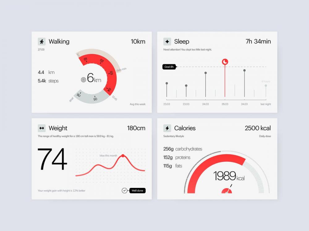 - 正向反馈:用绿色标注达标数据,用红色提示睡眠不足,用 "Well done" 等文案强化正向激励,贴合健康产品 "陪伴式管理" 的定位。