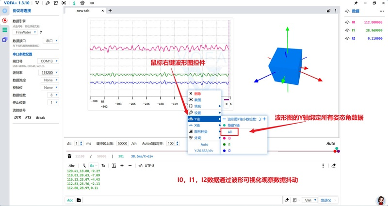 打开VOFA+,选择正确COM口,波特率115200,协议选Firewater。点击连接,即可看到Yaw/Pitch/Roll三通道实时波形