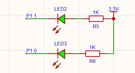 设计 LED 灯输出电路。选择 P1.0 和 P1.1 作为两个控制口,拿两个 0805 封装的贴片绿色 LED 灯。 接法注意: 51 单片机的 IO 口输出高电平时电流非常微弱,带不动 LED,所以不能把 IO 口接在 LED 的阳极。正确的做法是:电源接 3.3V,串联两个 1K 限流电阻后连到 LED 阳极,然后把 LED 的阴极连到单片机 IO 口。 这样,当 IO 口输出低电平(0V)时,形成电压差,LED 灯亮;输出高电平(3.3V)时,无电压差,LED 灯熄灭。