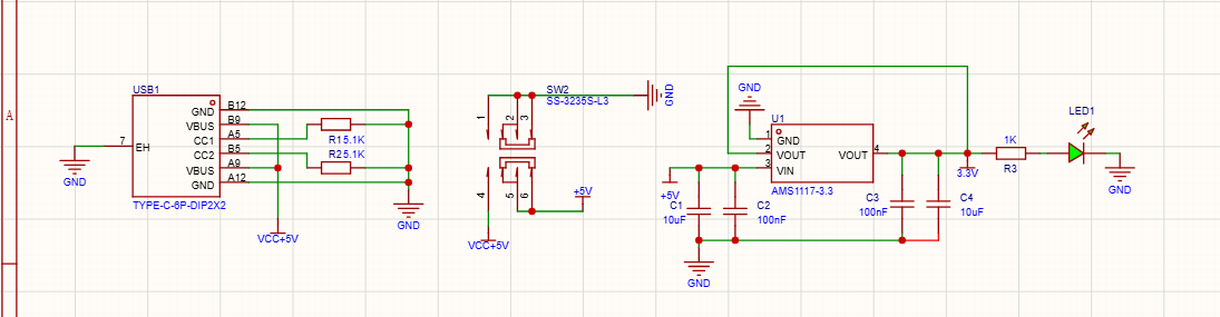 +5V,我们要通过 LDO(低压差线性稳压器)变成 3.3V。芯片选择AMS1117-3.3。首先把它的两个 VOUT(2脚和4脚)连接在一起并接上新的网络标签3.3V,GND 脚接地,VIN 脚接+5V。 - 电源指示灯: 为了直观显示电源状态,我们找一个绿色 0805 封装的 LED,串联一个 1K 的限流电阻。电阻一端连