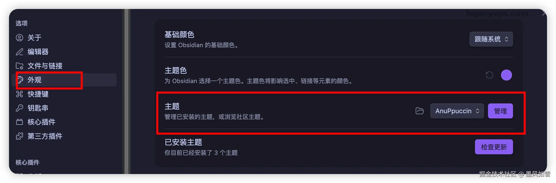 配置方式也很简单,点击左下角设置按钮,然后找到外观,主题设置就可以更换你自己想要的主题了。