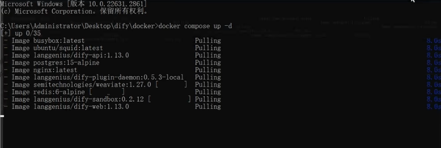 首次启动会下载所需镜像,耗时取决于网络状况。若部分镜像下载失败,可重新执行命令。