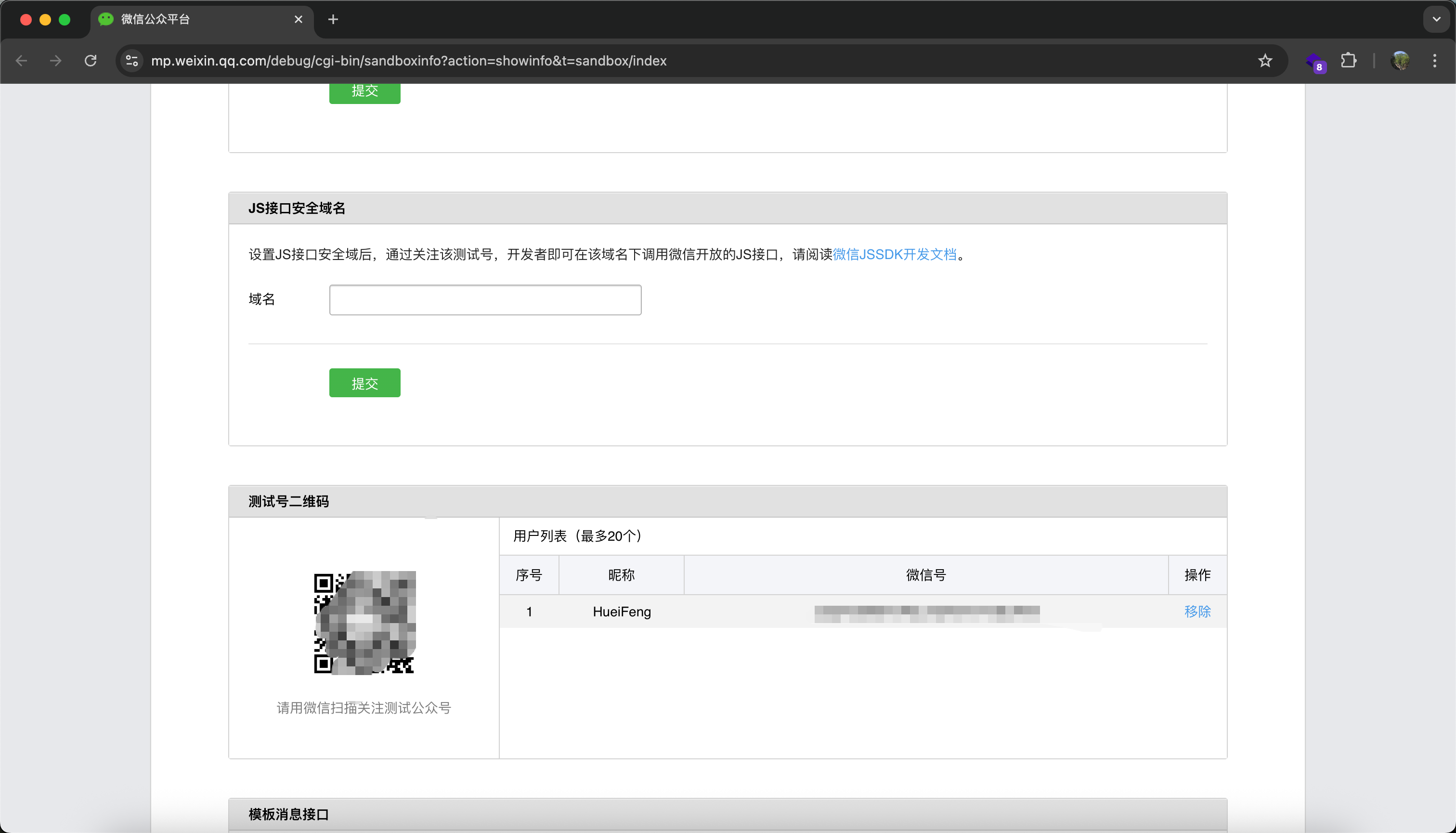 打开 微信测试号申请页面,微信扫码登录。