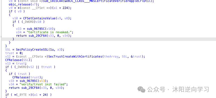 self+224处的 CFSet(吊销列表),如果证书序列号在集合中 → 返回错误"Certificate is revoked."