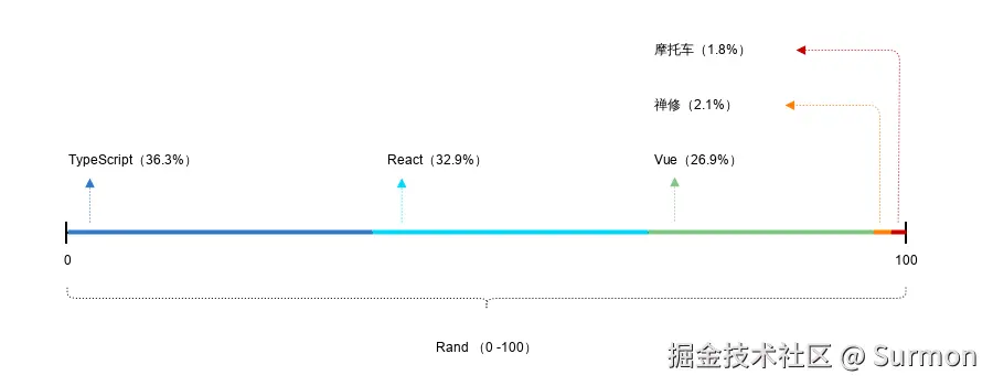 可以把它想象成,在一条数轴上按概率分配区间,每个词元按照自身的概率作为比例来占据数轴的一部分。然后生成一个 0 到 100 的随机数,落在哪个区间就选哪个词元。这样每个词元被选中的概率,刚好就等于它的概率数值。