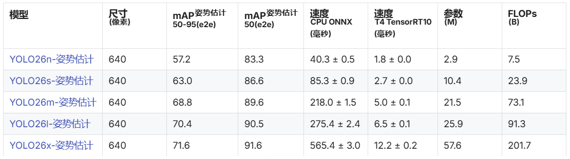 Ultralytics的YOLO26模型提供专门的姿势估计模型以支持姿势估计,其主要预训练模型及参数如下表所示,其中的"e2e" 代表端到端性能。