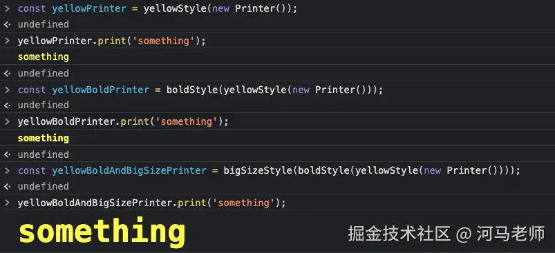 代码中的 yellowStyle、boldStyle 和 bigSizeStyle 分别是给 print 方法的装饰器,它们都会接收 printer,并以 printer 为基础复制出一个一样的对象出来并返回,而返回的 printer 与原来的区别是,各自 Decorator 都会为 printer 的 print 方法加上各自装饰的逻辑(例如改变字体、颜色或字号)后再调用 printer 的 print。