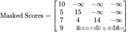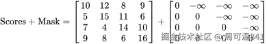 我们将这个 Mask 直接加到刚才算出的 Scores 矩阵上: