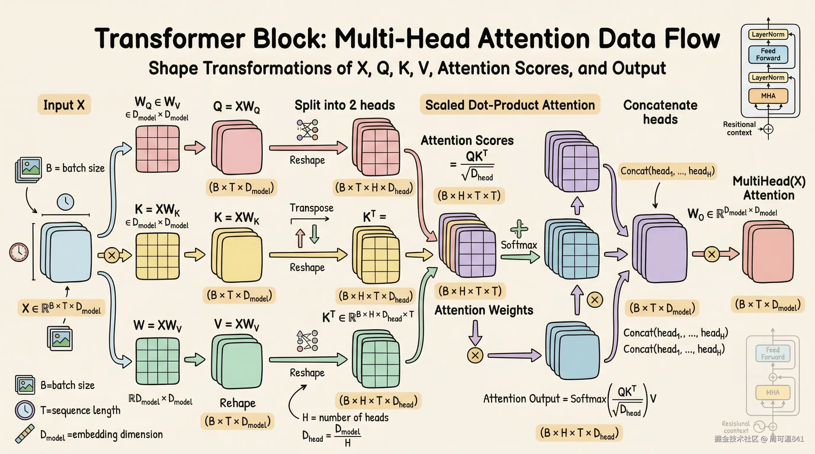 : 用大矩阵映射,依然是 [Batch, SeqLen, 512] - 拆分维度 (view): 变成