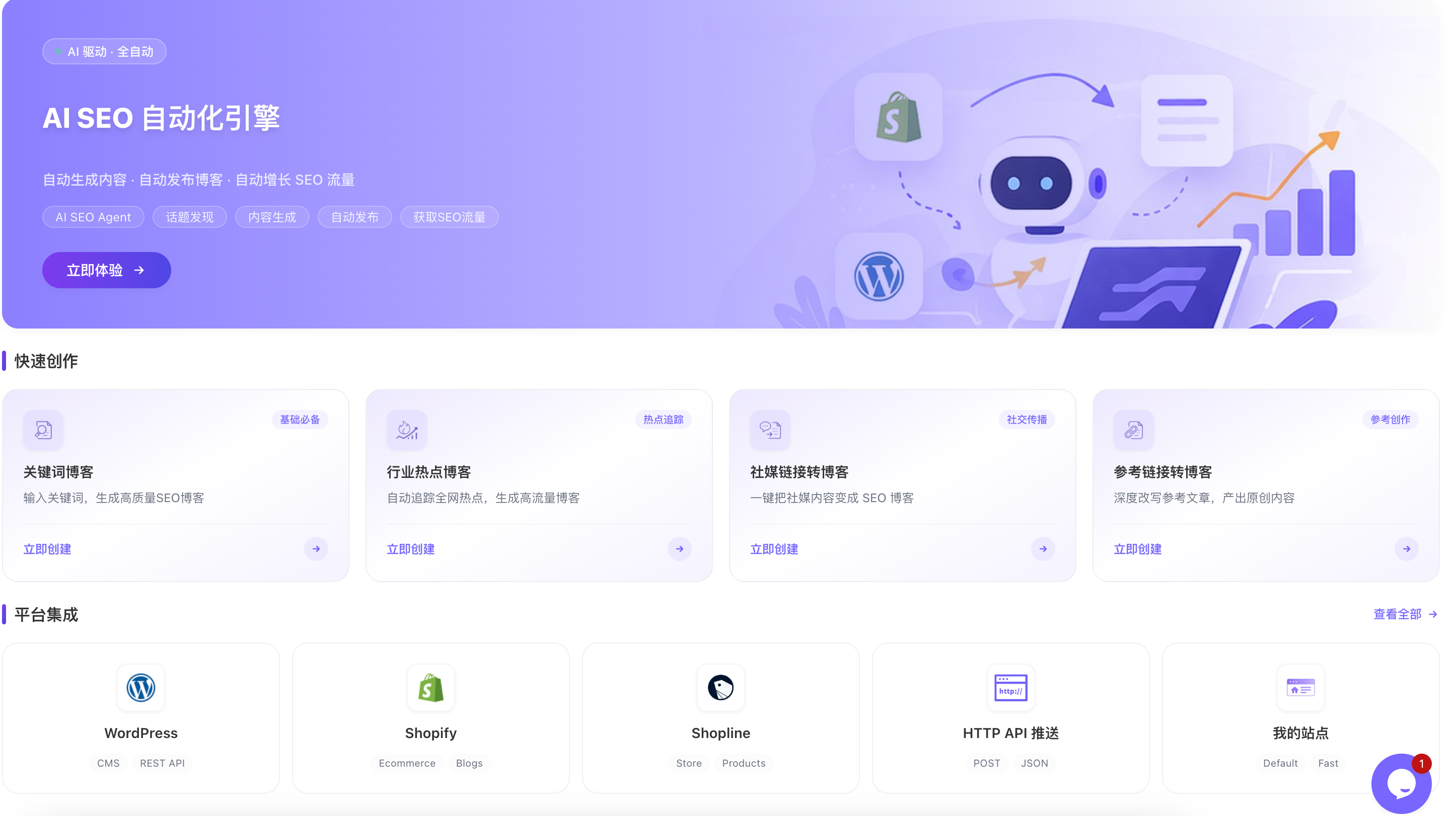 输入核心关键词和类型(教程、清单、对比等),一键生成结构化 SEO 长文,适合做基础内容矩阵。