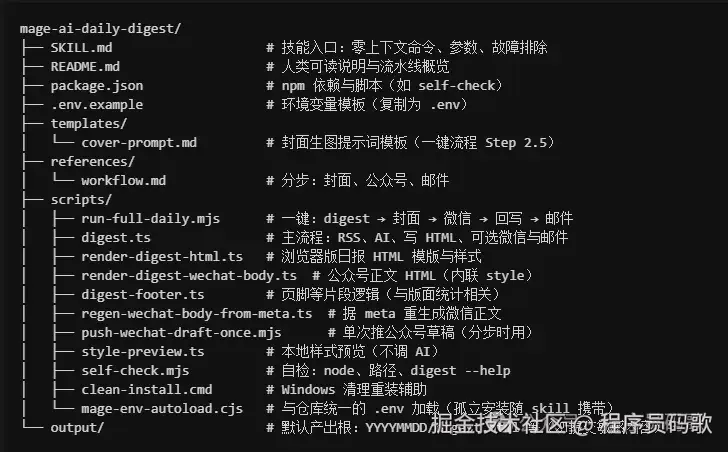 mage-ai-daily-digest 的本质不是「又一个 RSS 阅读器」,而是 把策展 + 版式 + 可选分发 固化成一条技能:源有出处、样式模版,输出直指 公众号与邮箱 两种阅读场景。