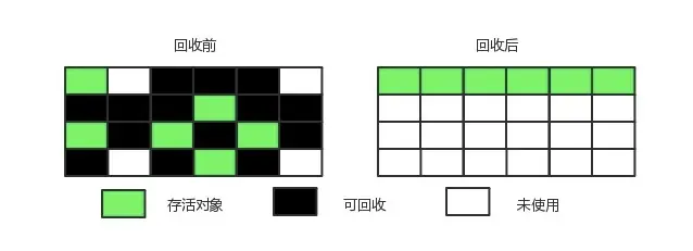 | 算法 | 标记-清除 | 标记-整理 + 复制 |