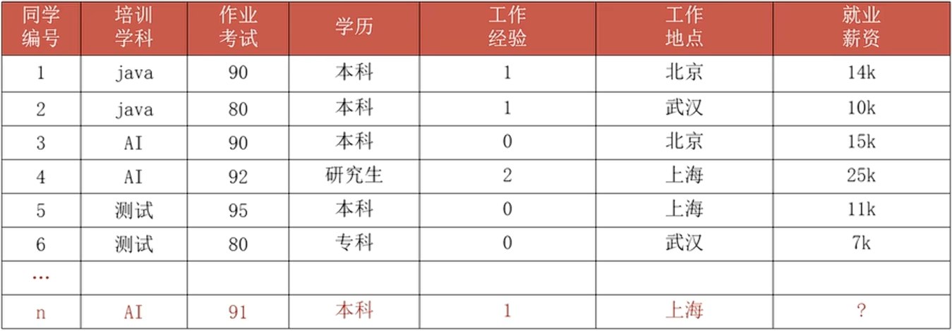 就如上面的表格,其中培训学科、作业考试、学历、工作经验、工作地点一起就是组成特征,就业薪资就是标签,每一行数据就是样本。
