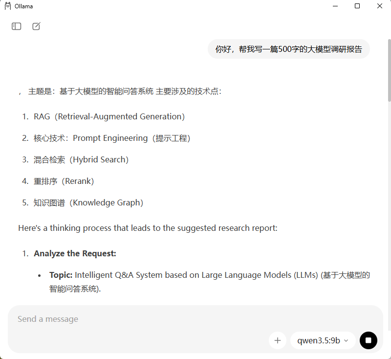在Ollama中,选中qwen3.5:9b模型,就可以问问题了。