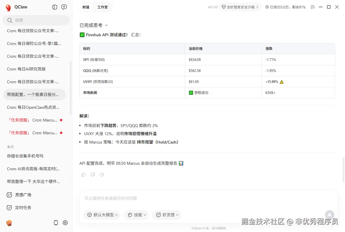 完成上面的操作,就可以通过qclaw来查询获取股票情况了。