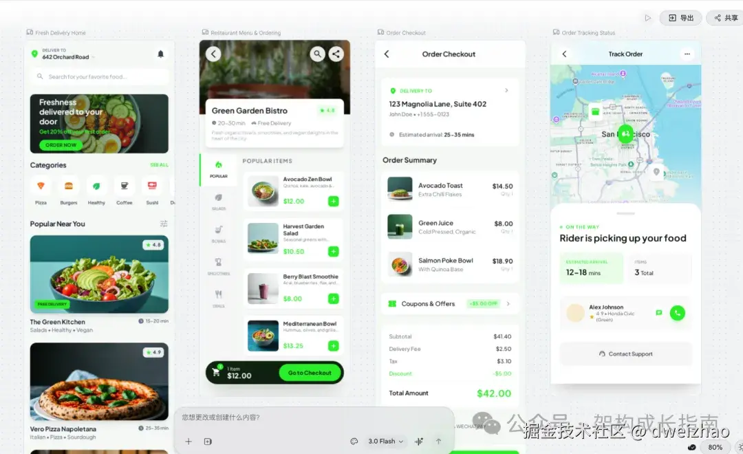 👉 多屏幕流程:描述一个完整的用户路径------登录 → 首页 → 下单 → 确认------一次给你五张,互相打通,点击"播放"就能预览整个流程。