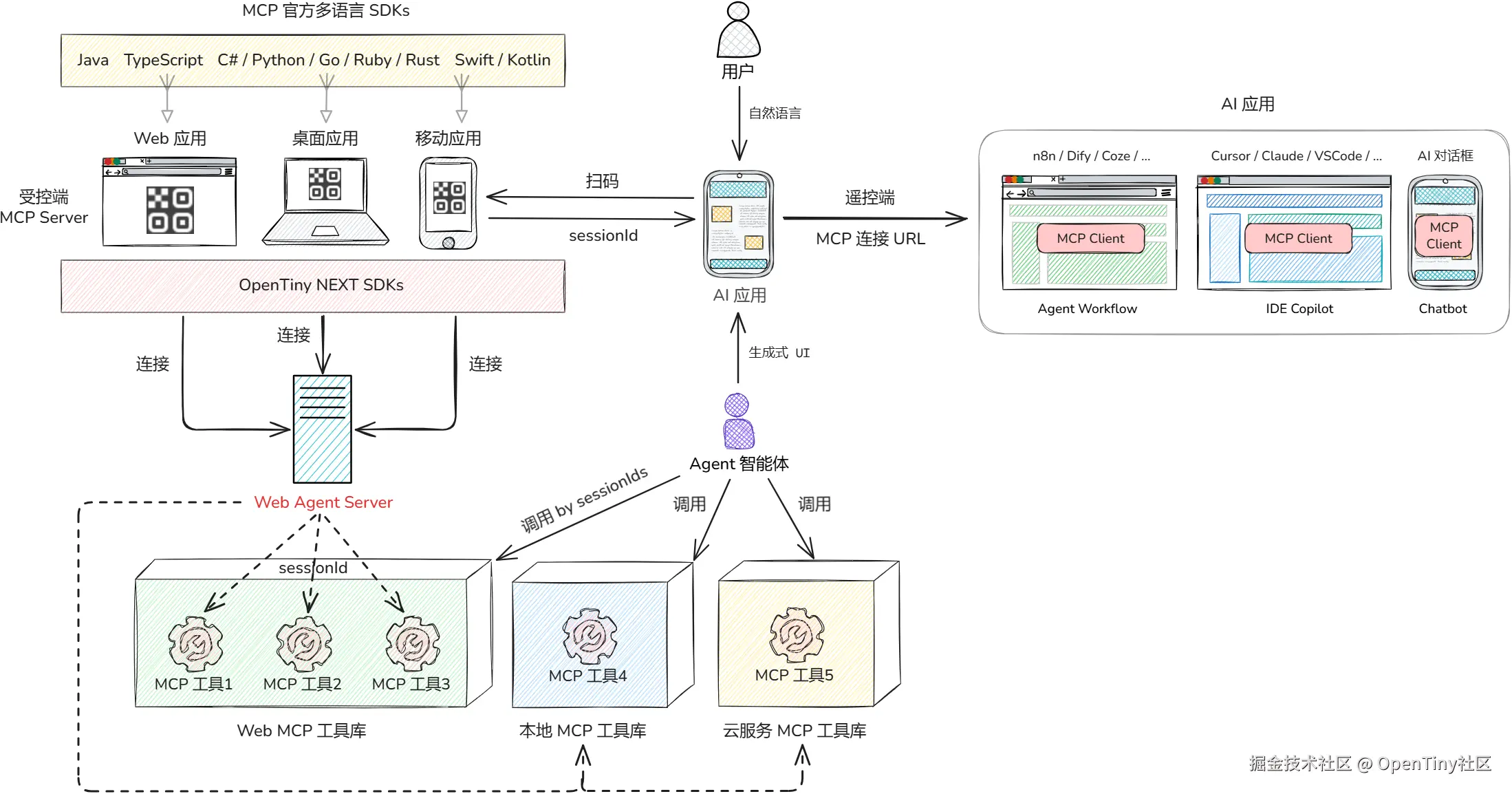 - 左侧 --- 受控端(Client) :网页应用、桌面应用、移动应用,通过 OpenTiny NEXT SDKs 连接到 WebAgent,把自己的业务能力注册为 MCP 工具。