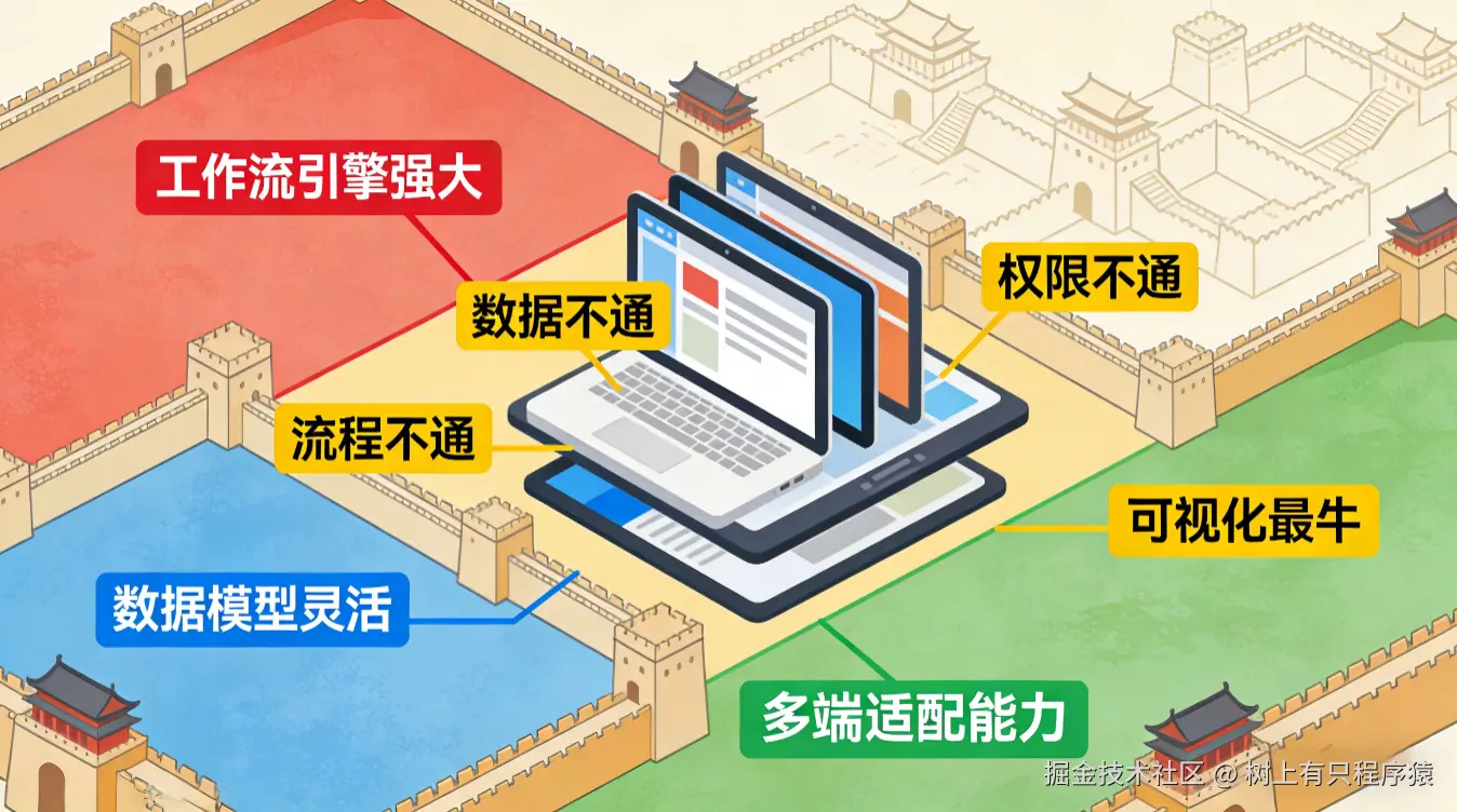 甲方想统一技术栈,结果发现不同部门已经用了三四种低代码平台,数据不通、流程不通、权限不通,比全代码开发还乱。