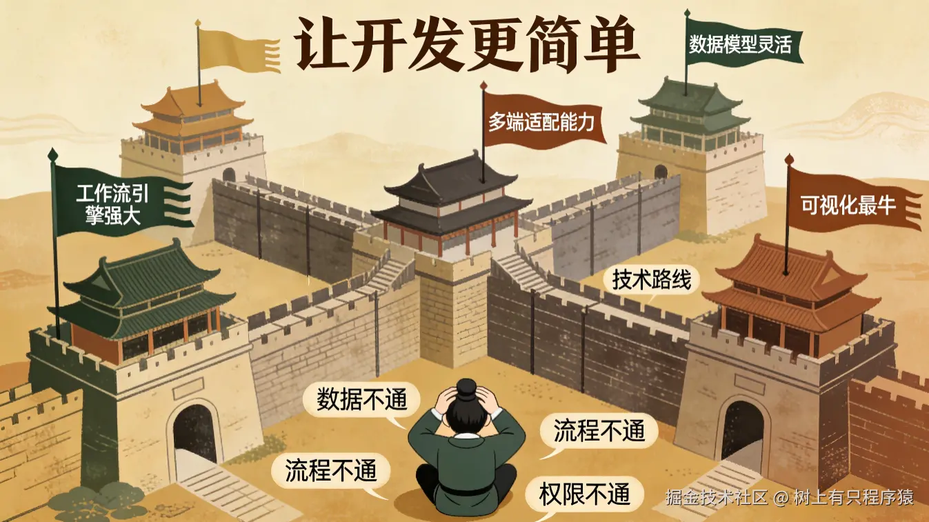 低代码开发平台的世界,如今就像春秋战国时期的诸侯割据------各种平台、各种引擎、各种规范层出不穷,表面上都是"让开发更简单",实际用起来却各有各的"方言",各有各的"城墙"。