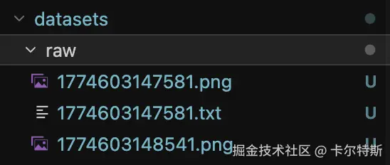 初始图片跟标注文件都在 datasets/raw 文件夹中,需要将这些标注按照官方格式区分出来,只需要使用下面脚本修改其中的 源文件夹 SOURCE_DIR 路径即可,会自动将图片与 .txt 标注文件自行按比例分割到对应文件夹。