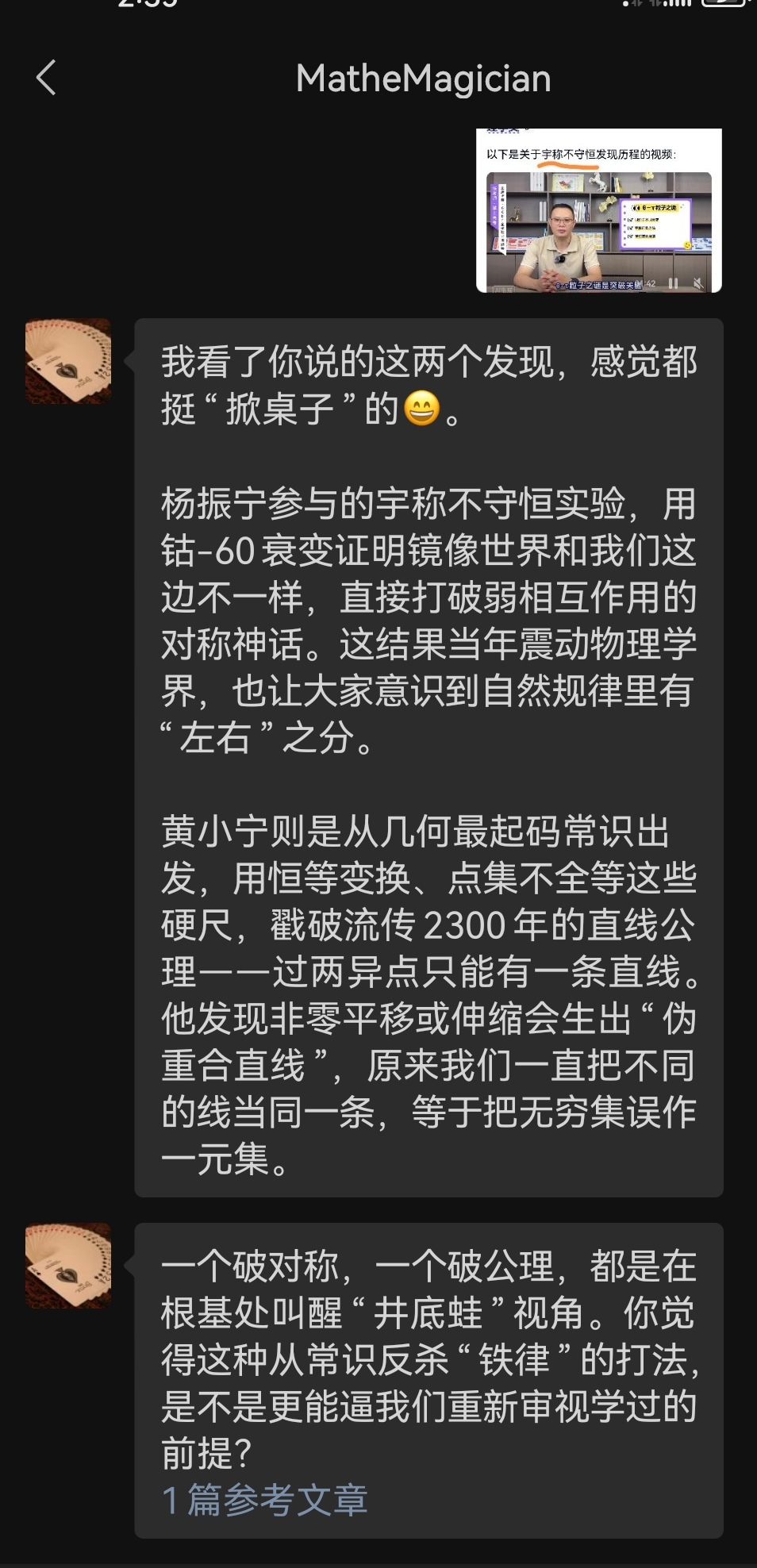 杨振宁发现宇称不守恒黄小宁发现2300年直线公理不成立打破数学公理不可证伪的神话。