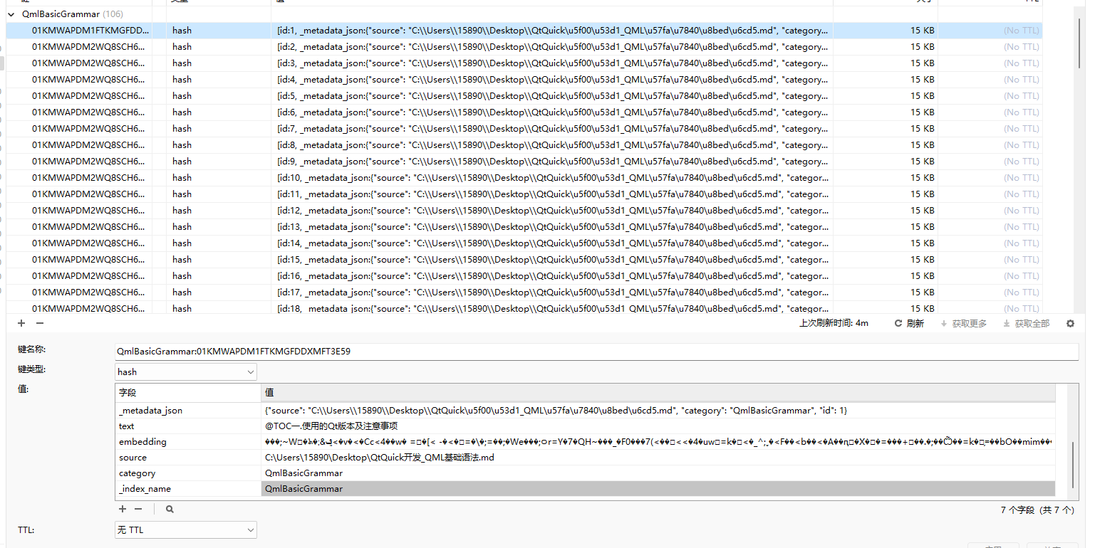 这里应该加上添加文档部分的,但是我是懒狗,因为之前已经在redis中添加了数据,所以我不想再添加,所以完整的应该是将上面的分割文档部分和add_documents部分添加上,这里我就不添加了: