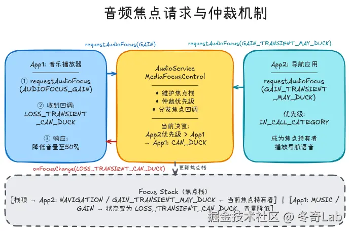 Android 的音频焦点(Audio Focus)机制 就是为了解决这个问题而生的。它本质上是一套礼貌协议:应用在播放音频前先"举手申请",系统统一仲裁,通知其他应用"请暂停"或"请降低音量"。