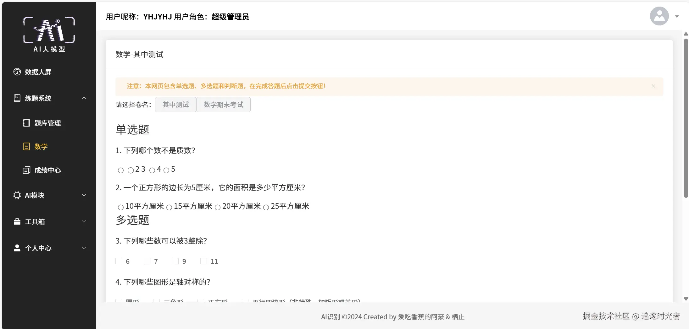登录注册、数据大屏、题库系统、AI模块、工具箱、个人中心等。