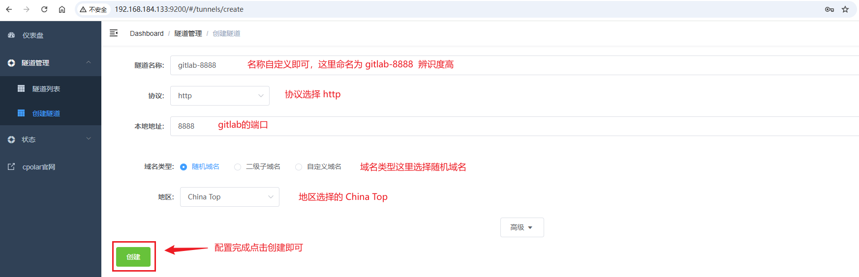 接着点击创建隧道菜单,进入到创建页面,如下图配置: