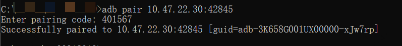 在电脑终端中,输入配对命令: adb pair ip:port,输入6位配对码。看到 Successfully paired 即表示配对成功