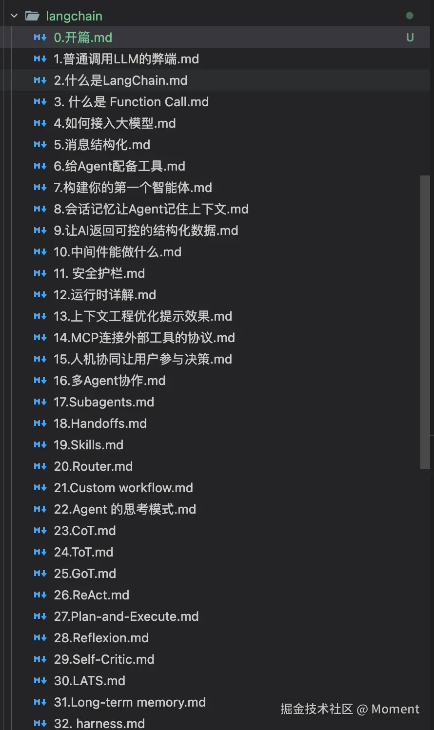 开头一大段都在打基础,裸调模型哪里别扭、LangChain 在补什么、Function Call、消息结构、工具怎么接、先跑一个最简单的 Agent、再加上会话记忆和结构化输出。拆开看是很多篇,合起来就是在说一件事,模型是怎么被接进一条可执行的链路里的。