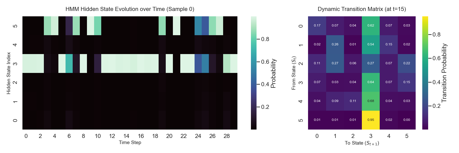 - 转移矩阵随序列特征自适应调整,而非固定值,体现了 Deep-HMM 的动态建模能力。